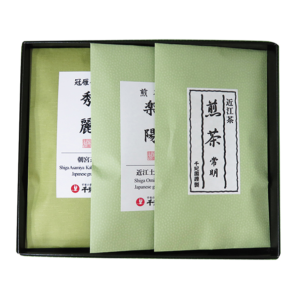 草津店取扱い商品〈千年の香り千紀園〉朝宮茶・近江茶詰合せ(朝宮冠雁ヶ音「秀麗」80g・近江煎茶「楽陽」80g・近江煎茶「常明」80g)