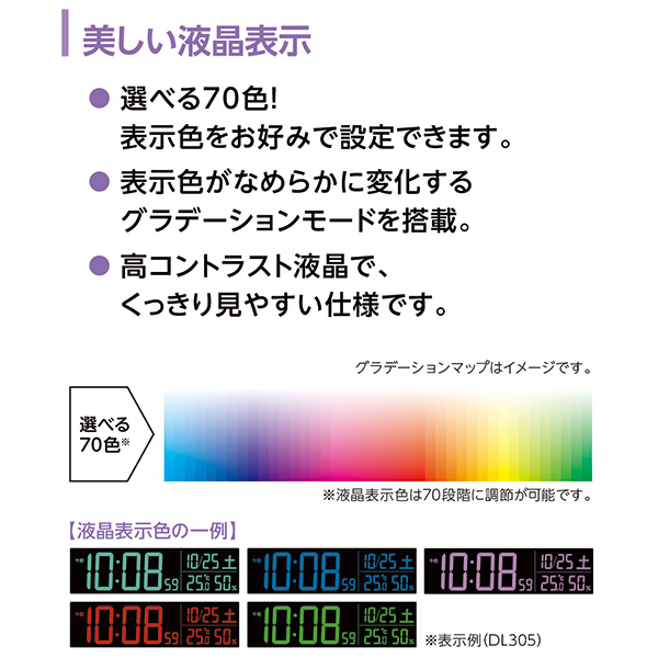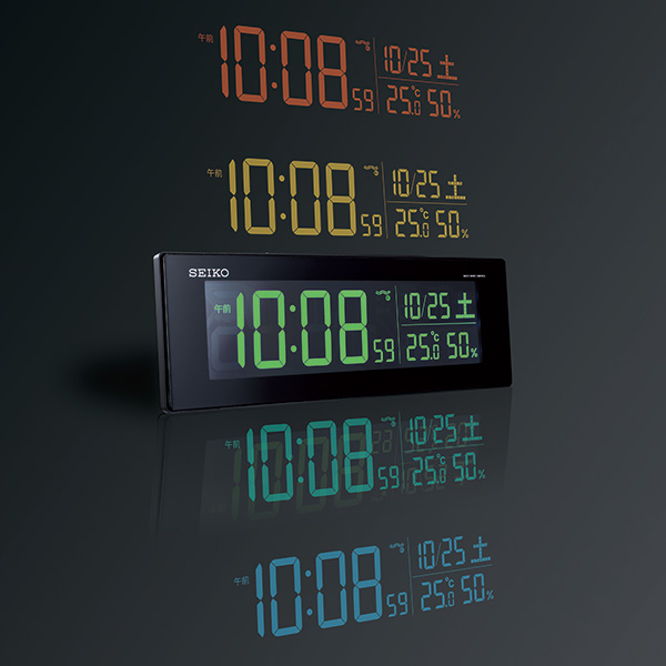 抜群の視認性で70色の中からお好みで表示色を設定、時を彩る交流式デジタル時計