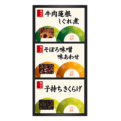 ■内容量:牛肉蓮根しぐれ煮50g、子持ちきくらげ65g、そぼろ味噌味あわせ90g