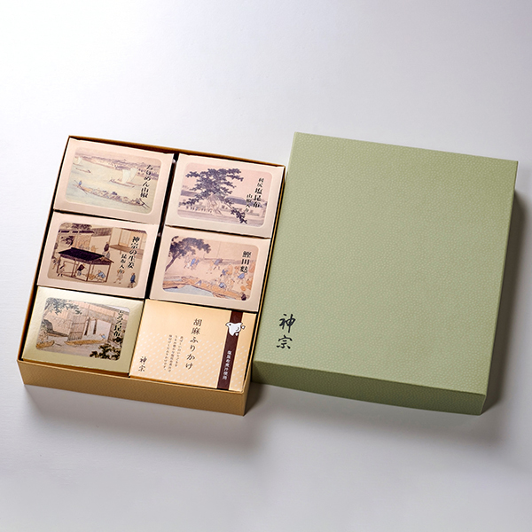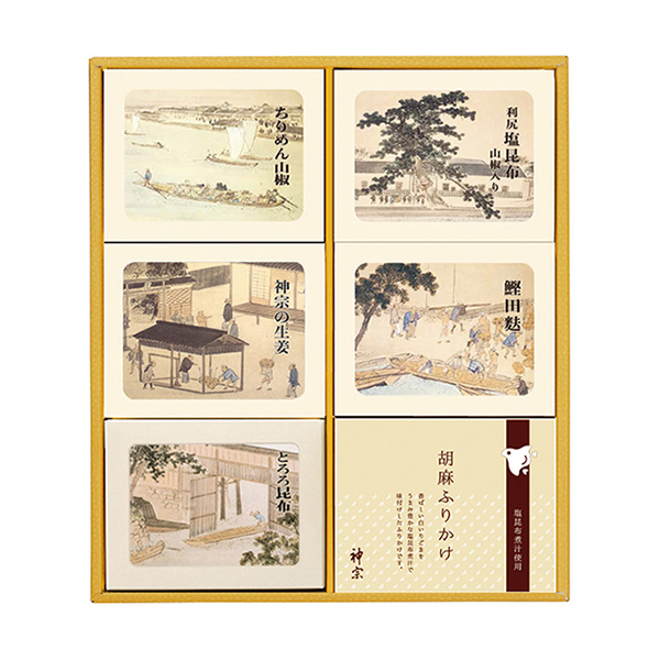 山椒入り利尻塩昆布と甘辛いちりめん山椒、鰹田麩、とろろ昆布、神宗の生姜、胡麻ふりかけ6種類のお詰め合せです。