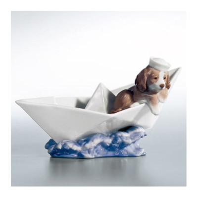 折り紙で作られた舟に水兵さんの帽子をかぶった仔犬が乗っています。