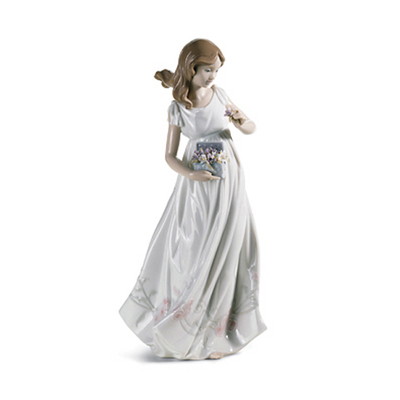 そっと目を伏せ物思いにふける瞬間、輝かしい未来の夢や希望、大切な人、家族との想い出…。どんな思いが胸に去来しているのでしょうか。リヤドロは、ドレスの細かな織り目や風に吹かれる様子、そして指先の一本一本にいたるまで、磁器とは思えないほど繊細で柔らかく描き出しています。