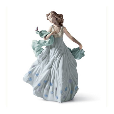 そっと目を伏せ物思いにふける瞬間、輝かしい未来の夢や希望、大切な人、家族との想い出…。どんな思いが胸に去来しているのでしょうか。リヤドロは、ドレスの細かな織り目や風に吹かれる様子、そして指先の一本一本にいたるまで、磁器とは思えないほど繊細で柔らかく描き出しています。