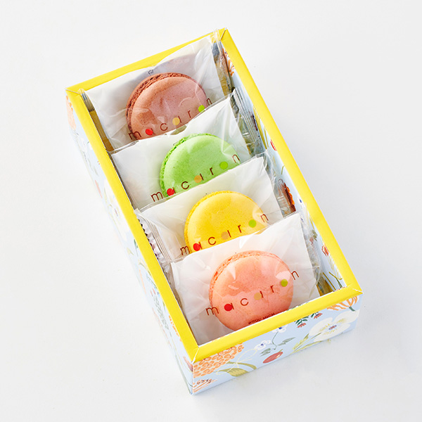 色とりどりでキュートなマカロン。4種類のガナッシュクリームをサンドしました。フランボワーズ(ピンク)、アプリコットバナナ(黄)、洋梨(緑)、カフェ(茶)